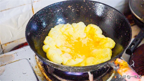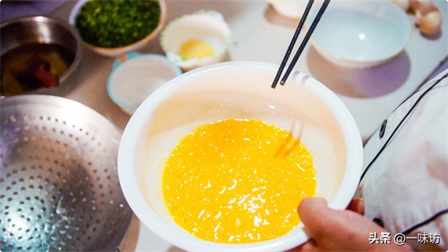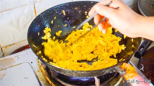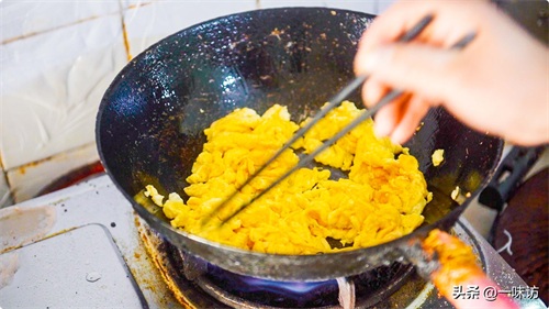 鸡蛋准备6个打入一个大碗中,撒上少量的盐。搅拌均匀后在锅中倒入少量油进行煎制鸡蛋,一般鸡蛋煎稍微老一些这样的鸡蛋味更香。把鸡蛋倒入锅中,一边炸一边用筷子搅拌这样做出点鸡蛋比较松散。鸡蛋炸好之后放在一个碗中备用。