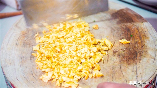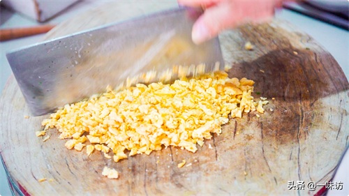 将煎好的鸡蛋到在案板上,用到一起剁成小块的鸡蛋碎,方便我们馅料的一起搅拌均匀入味。