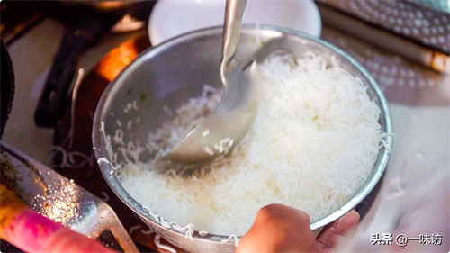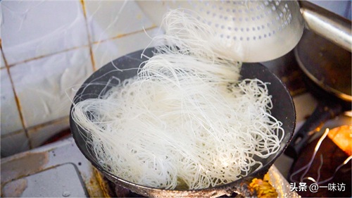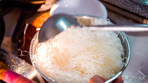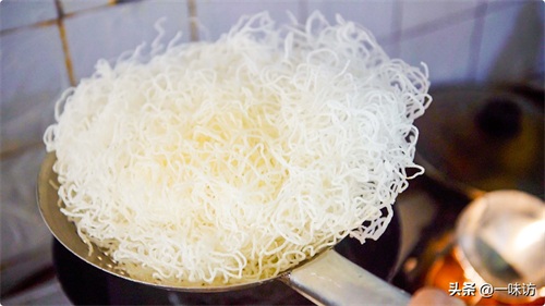 2、炸粉丝时要进行两面油炸,控制不好油温我们先在锅中下入一根粉丝观察。当粉丝被炸蓬松时,此时油温正好就可以下入所有的粉丝了。