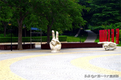 公园北门正门进去后湖畔小广场的手势雕塑