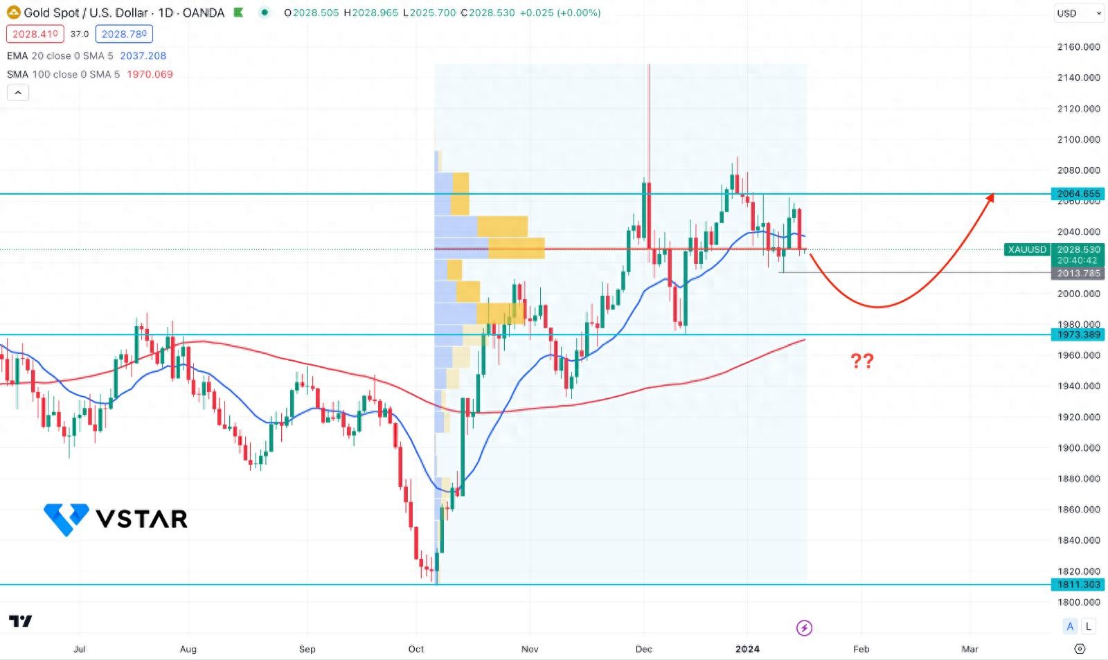 如果金价无法重新站稳20日均线上方,我们可能预计金价将进一步跌向1973.00支撑位。当每日蜡烛线高于 2054.00 水平时,立即出现看涨反转后,可能会出现做多机会。