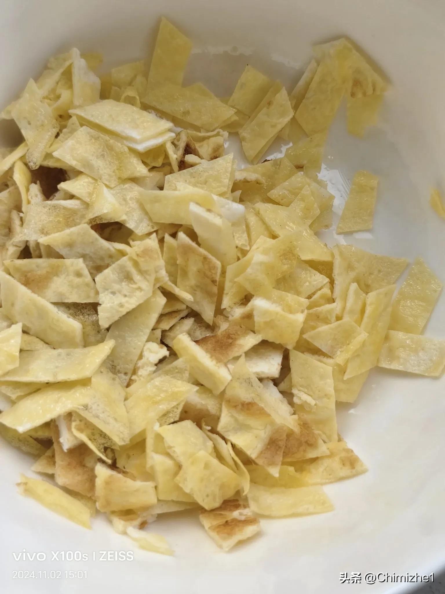3.锅烧热,然后倒入少许菜籽油,将鸡蛋液摊成薄饼,饼切成小菱形块;