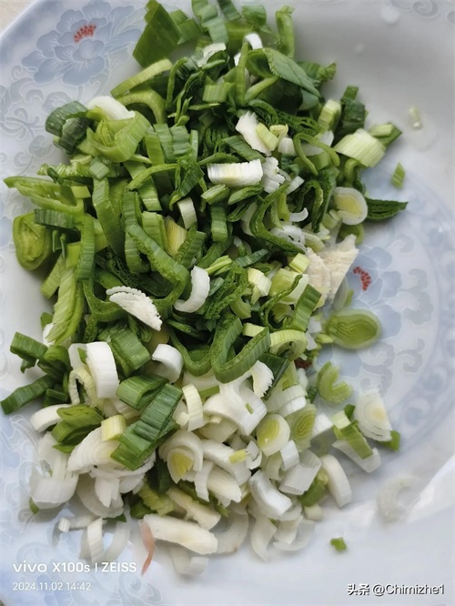 2.红萝卜(土豆、豆角)切成小薄片,蒜苗(大葱)切花,韭菜切成约5毫米的段,姜切末,泡发好的木耳切碎,黄花菜切成约1.5厘米的段;