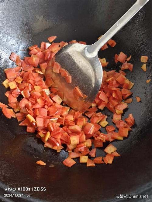 5.做汤。锅中倒入适量菜籽油烧热,将姜末爆香,尔后加入适量香醋,煮大约1分钟,待香味四溢时加适量水烧开,放肉臊子、炒熟的红萝卜(土豆、豆角),加入盐、五香粉、味精、白糖、生抽调味,酸度不够可以再加香醋,再加蒜苗(大葱、韭菜)花、鸡蛋片,香浓的臊子面汤就做成了。