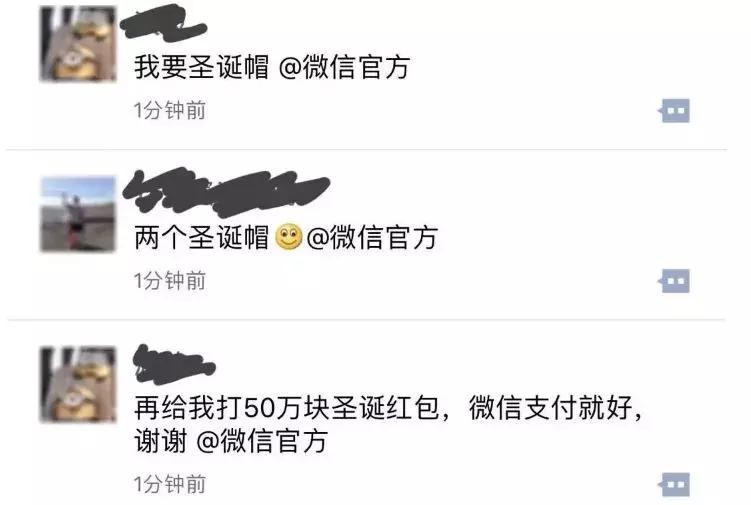 今天,不少网友被“请给我一顶圣诞帽@微信官方”刷屏了: