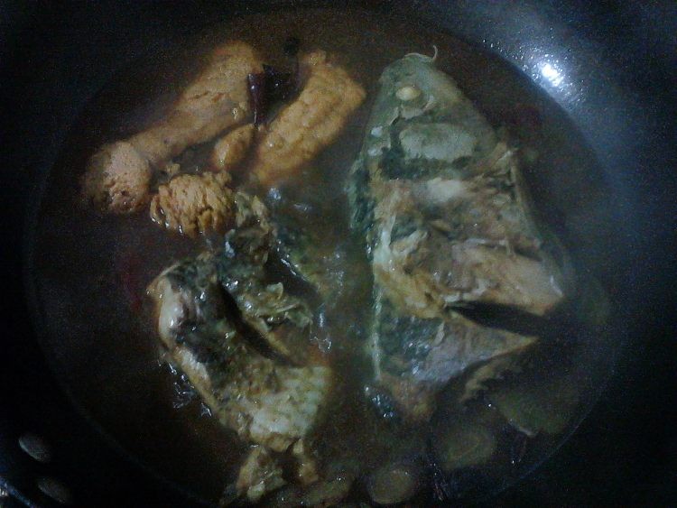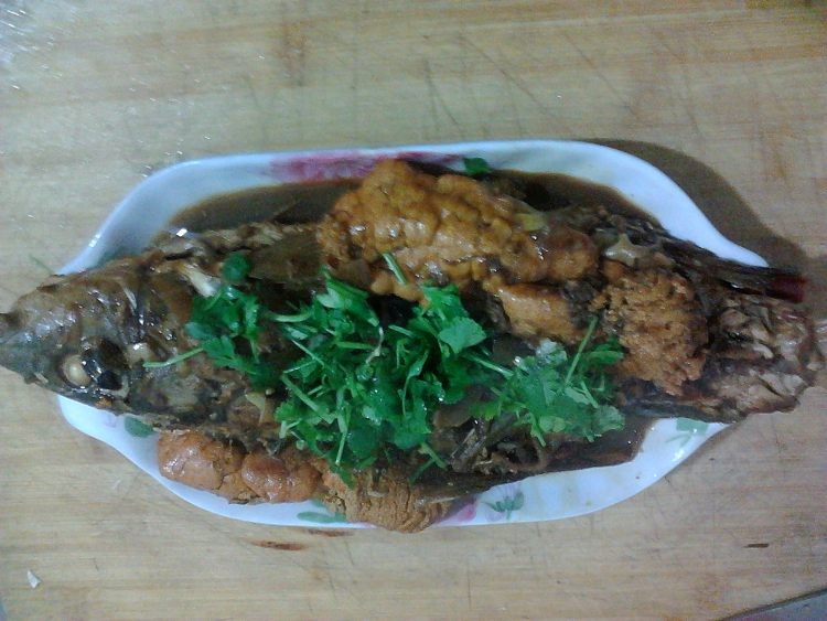 6 调料出香味后,加入料酒和老抽,然后放入水,加入少许白糖提鲜。放入鱼子和鱼泡(不喜欢的可以扔掉)。大火烧开,小火慢炖20分钟左右。