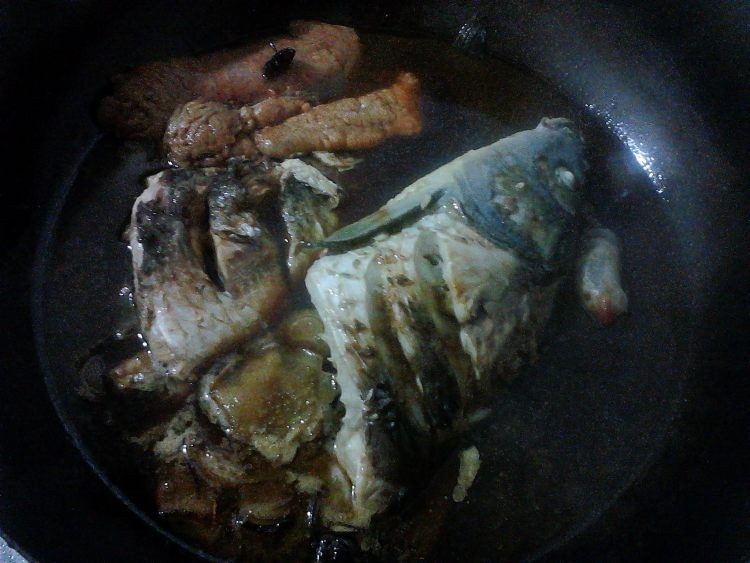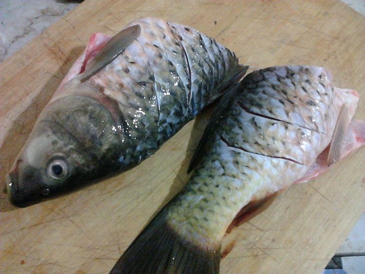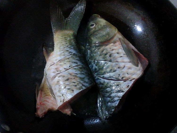 2 鱼比较大,所以切成了两截,打斜刀,容易入味