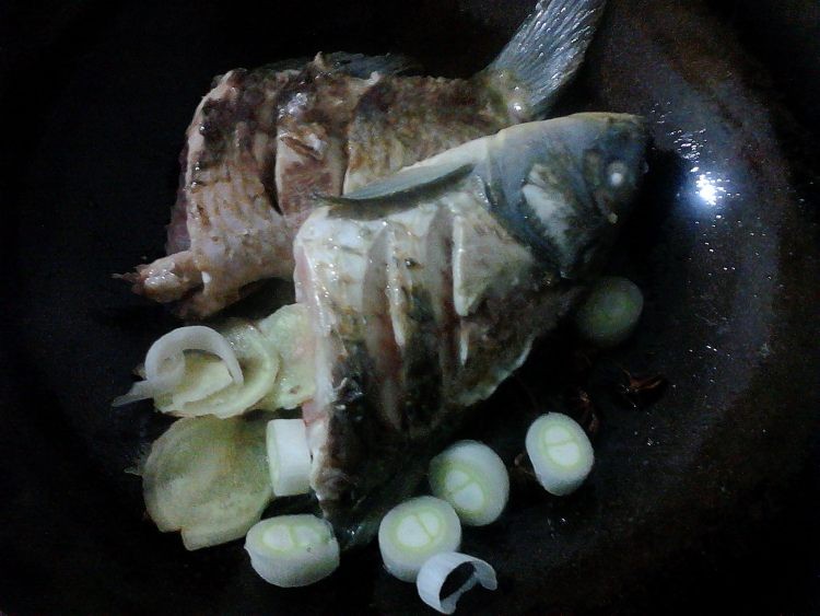 5 一面煎好后翻面煎另一面,煎好后放入八角,花椒,生姜,大葱和干辣椒。