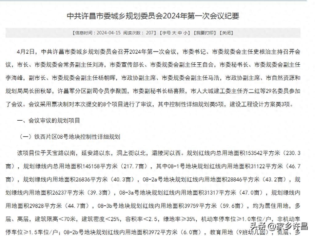许昌市自然资源规划局官方网站,2024年4月15日,发布2024年第一次城乡规划委员会规划纪要,共8个规划内容,规划项目涉及魏都区,示范区,东城区,建安区。