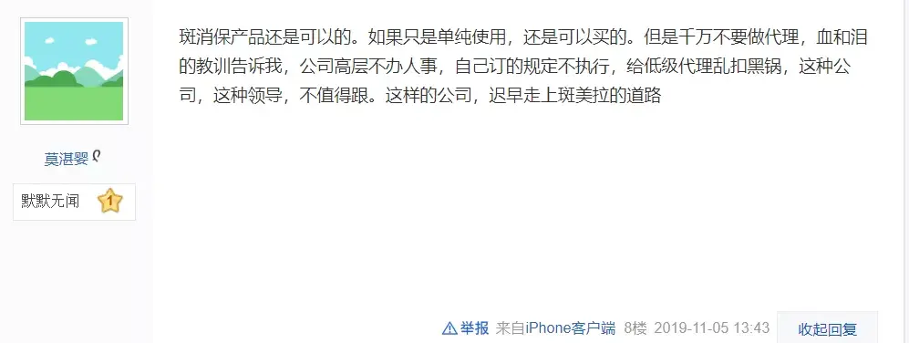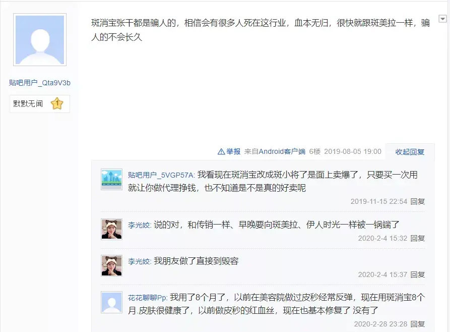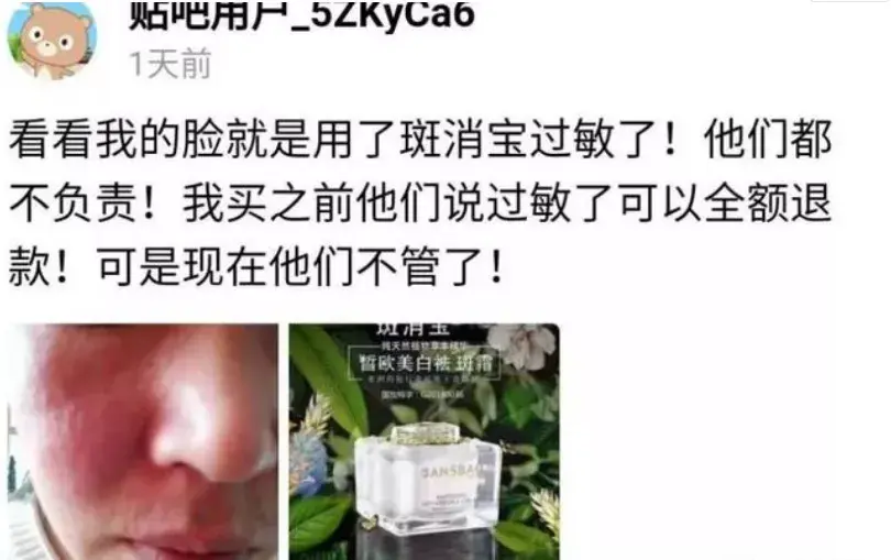 但对外宣传力度上,斑消宝一点不比斑美拉低调,斑消宝曾用名是“斑小将”,主打产品功效是祛斑美白,斑消宝曾让柳岩做了代言并在云南卫视播出广告。但是据澎湃新闻在内主流媒体报道显示,多位消费者使用斑消宝之后出现了皮肤过敏,甚至久治不愈的情况,然而更令消费者不放心的是,斑消宝公司对此置之不理,还将多位替消费者维权的代理商直接拉黑,态度傲慢之余,更是对消费者健康的轻视。