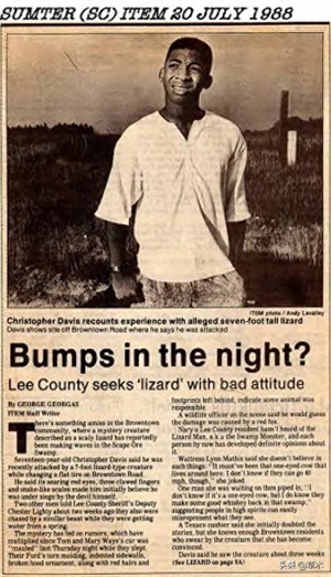 1988年的美国南卡罗莱那州,Bishopville市Lee县附近车程约9分钟的一处沼泽,17岁的当地少年克里斯托弗·戴维斯下班后驱车回家途中首次遭遇了该生物,并且车辆侧视镜被该生物严重损坏,车顶也出现了刮痕。