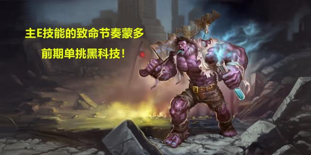 2、祖安狂人:蒙多前期单挑必须点出E技能,带上致命节奏,一级站撸不虚奥拉夫