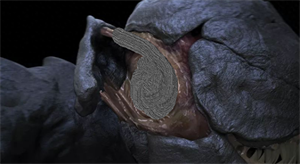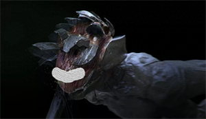 死亡天使除了触觉,唯一感知器官就是头部的巨耳。当接收震波时,它的头部铠甲会自动散开露出耳蜗。(这也是它最脆弱的时候)