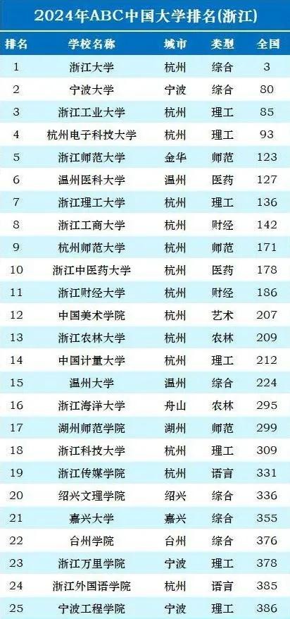 2024年浙江省36所大学排名:浙大第1,浙工大第3,杭州师大第9