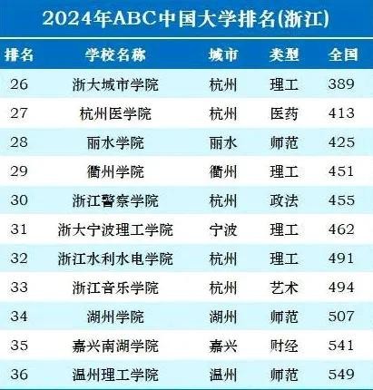 2024年浙江省36所大学排名如下: