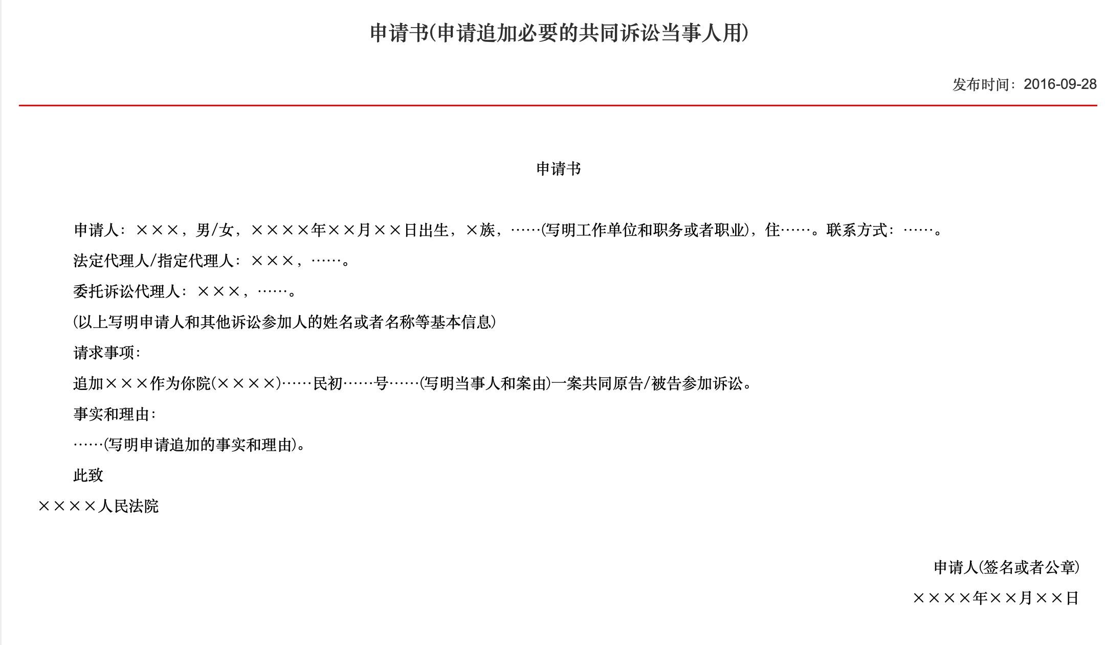 在我们收到传票、应诉通知书等诉讼材料后,首先看一下起诉状中有没有列明你的车辆投保的保险公司,如果没有,可以向法院申请追加保险公司为共同被告。申请书(申请追加必要的共同诉讼当事人用) - 诉讼文书样式 - 中华人民共和国最高人民法院