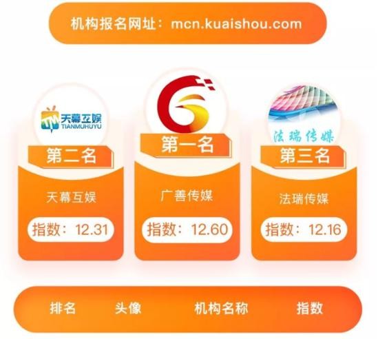与10月份榜单不同的是,广善传媒、天幕互娱及法瑞传媒分别荣获《快手MCN 11月影响力榜》TOP3,而快手在10月份公布的机构影响力榜单前三名则分别是飞多宝文化、法瑞传媒及芊盟。