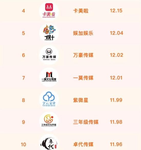 同时,《快手MCN 11月影响力榜》TOP4-TOP10依次是卡美啦、娱加娱乐、万豪传媒、一莫传媒、紫微星、三年级传媒、卓代传媒。