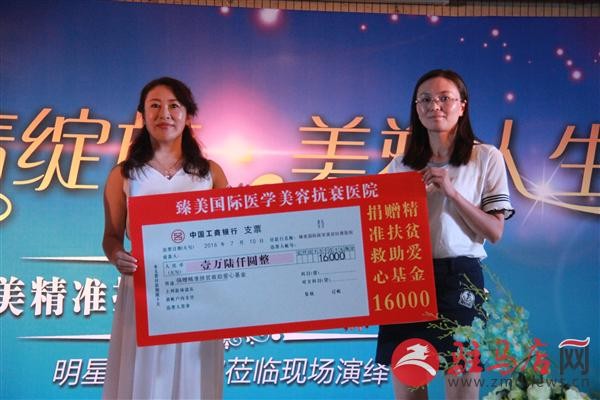 驻马店网讯(本网民生部 周由)7月10日下午, 由臻美国际医疗整形抗衰医院发起的“臻情绽放 美塑人生 ”的臻美精准扶贫慈善爱心捐助公益活动在我市举行。据悉,此次爱心捐助活动,臻美国际医疗整形抗衰医院向上蔡县重阳街道办事处李斯楼社区的部分贫困村民和驿城区贫困大学生崔浩坤共捐出16000元爱心善款。