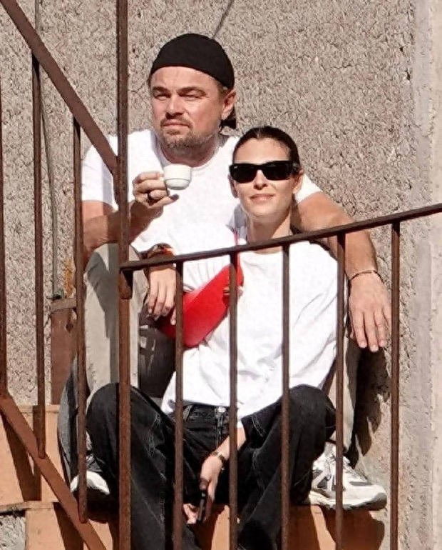 小李子与26岁超模女友一起坐在户外楼梯上享受日光浴。