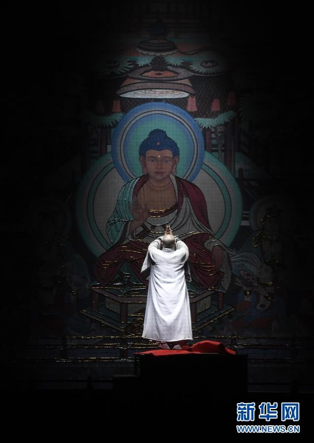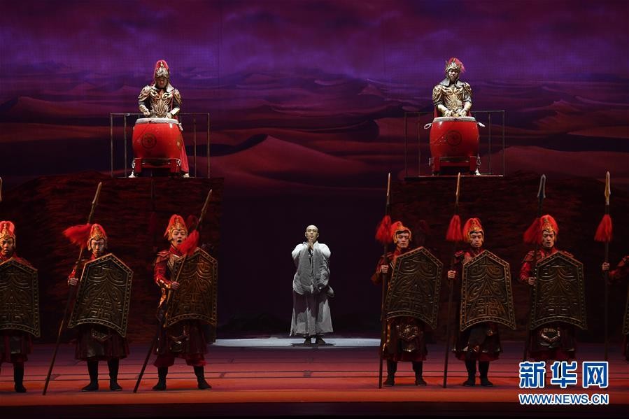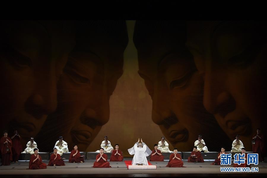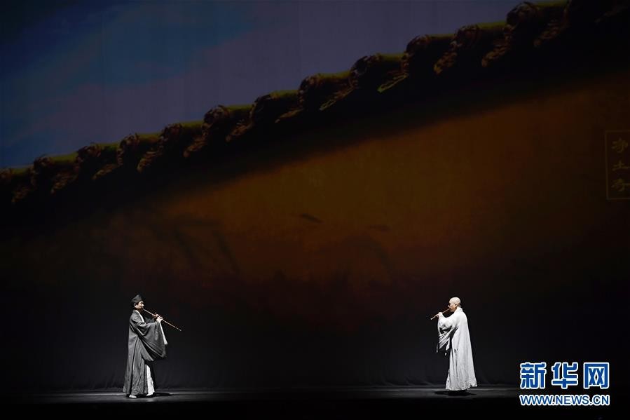 1月25日,在美国首都华盛顿的肯尼迪表演艺术中心,演员在中央民族乐团大型民族器乐剧《玄奘西行》中表演。 新华社记者 刘杰 摄