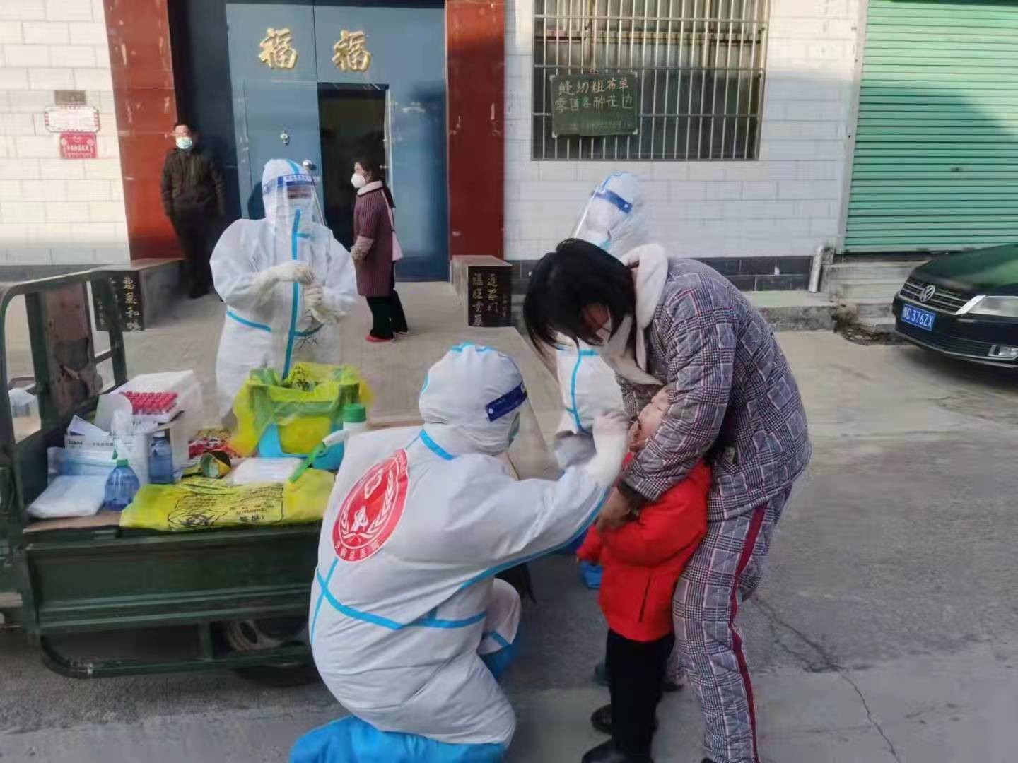 1月15日,安钢总医院医护人员杨静荣在伏道镇西官庄村农户上门核酸检测时,因身高差的原因,为了更好地完成核酸采样不得不采用这样的姿势,才能够顺利完成对孩子的采样。