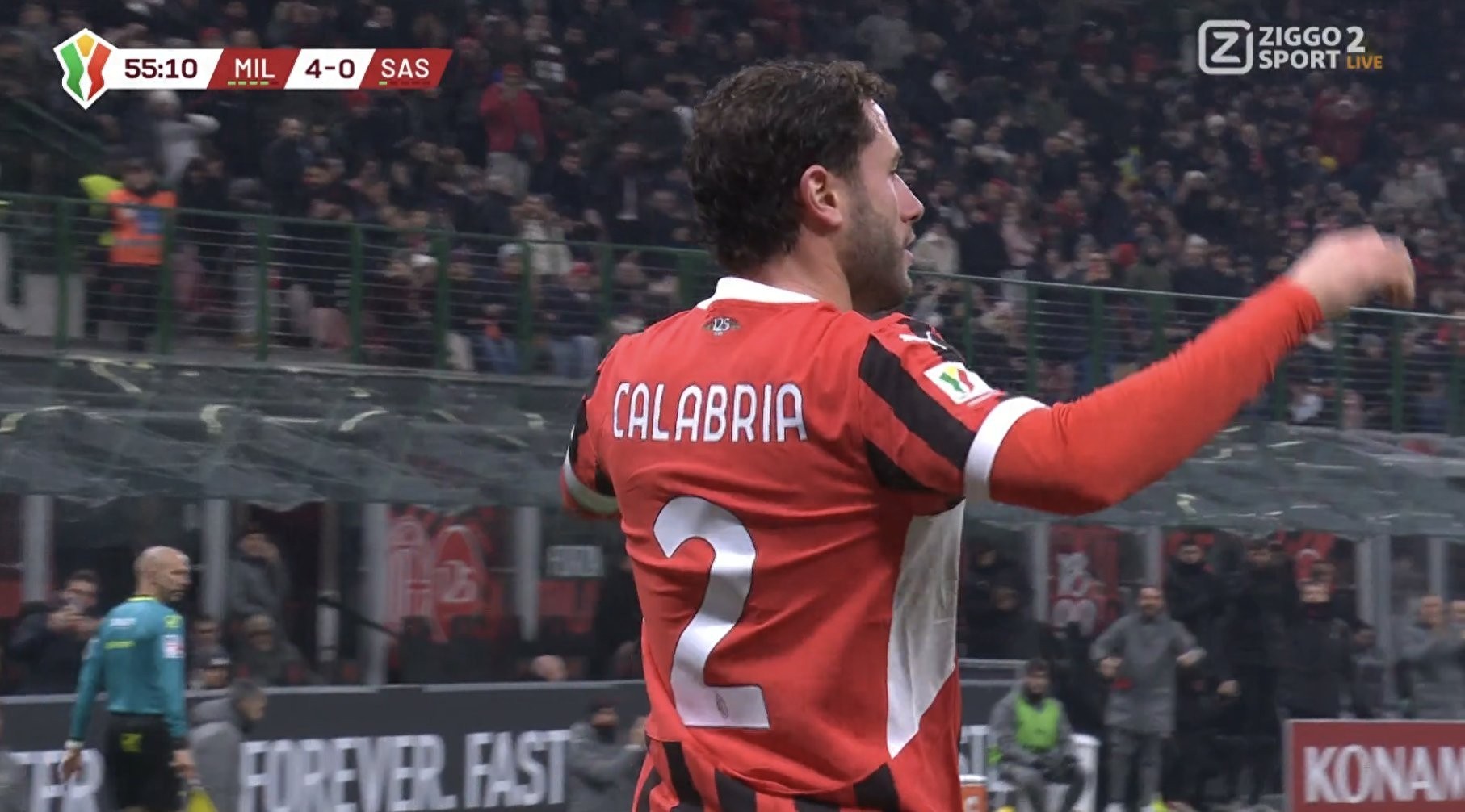 意大利杯1/8决赛主场迎战萨索洛的比赛中,卡拉布里亚的进球帮助米兰取得5-0的领先。