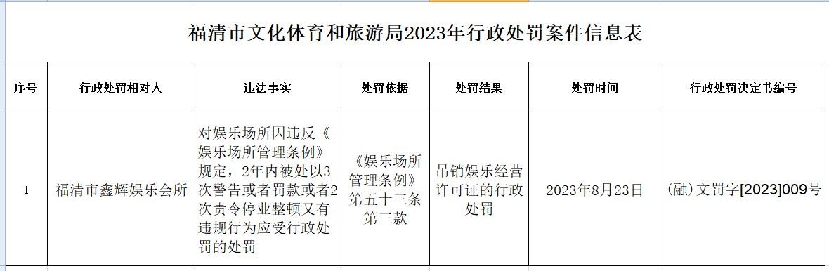 福建福清市文化体育和旅游局近日对福清市鑫辉娱乐会所存在的违规行为依法作出吊销娱乐经营许可证的行政处罚。