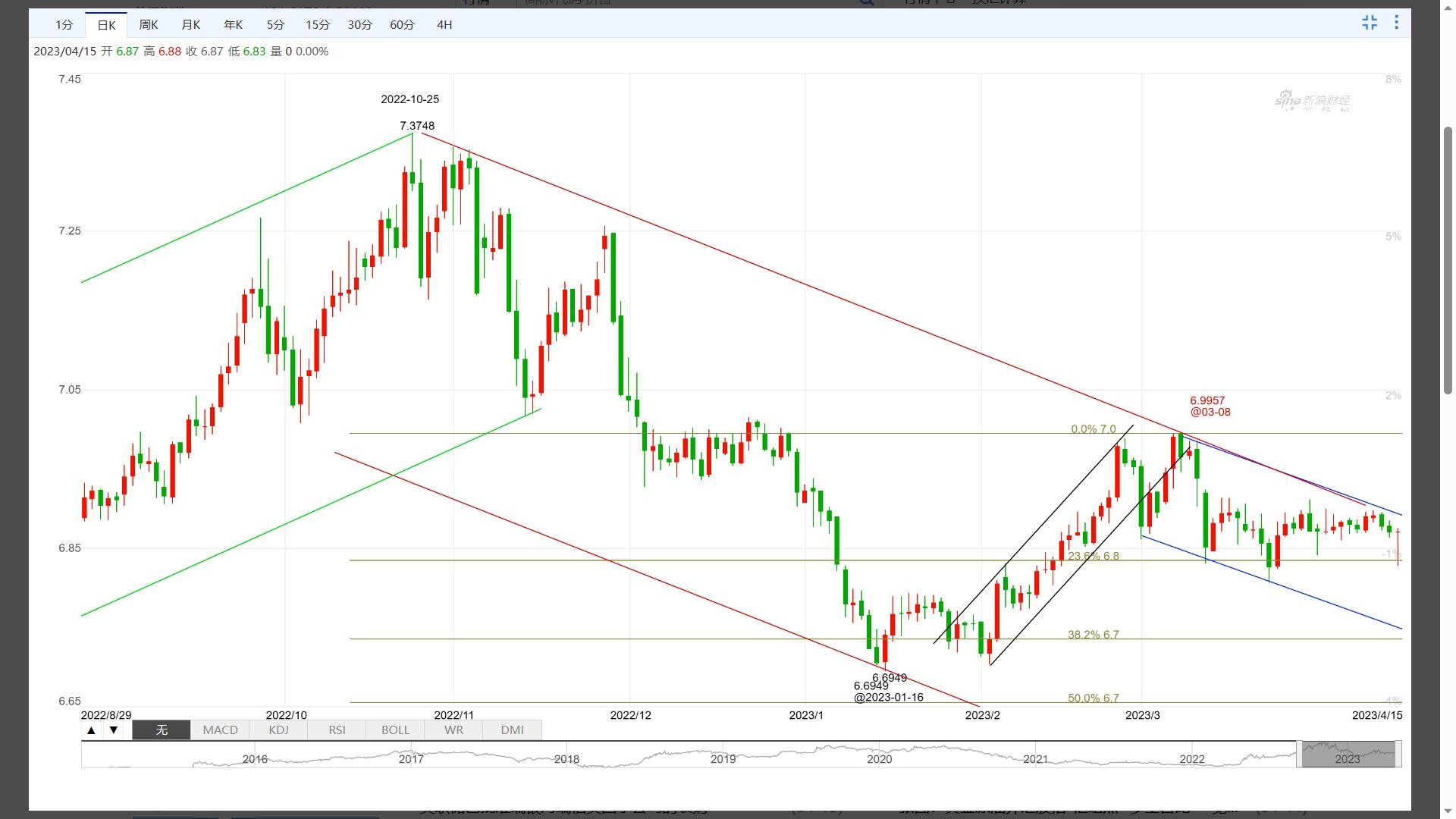 离岸人民币的短期趋势:是日线图上的蓝色升值通道,其上轨和中期趋势的红色上轨几乎重合。这个趋势始自6.9957@2023-03-08。