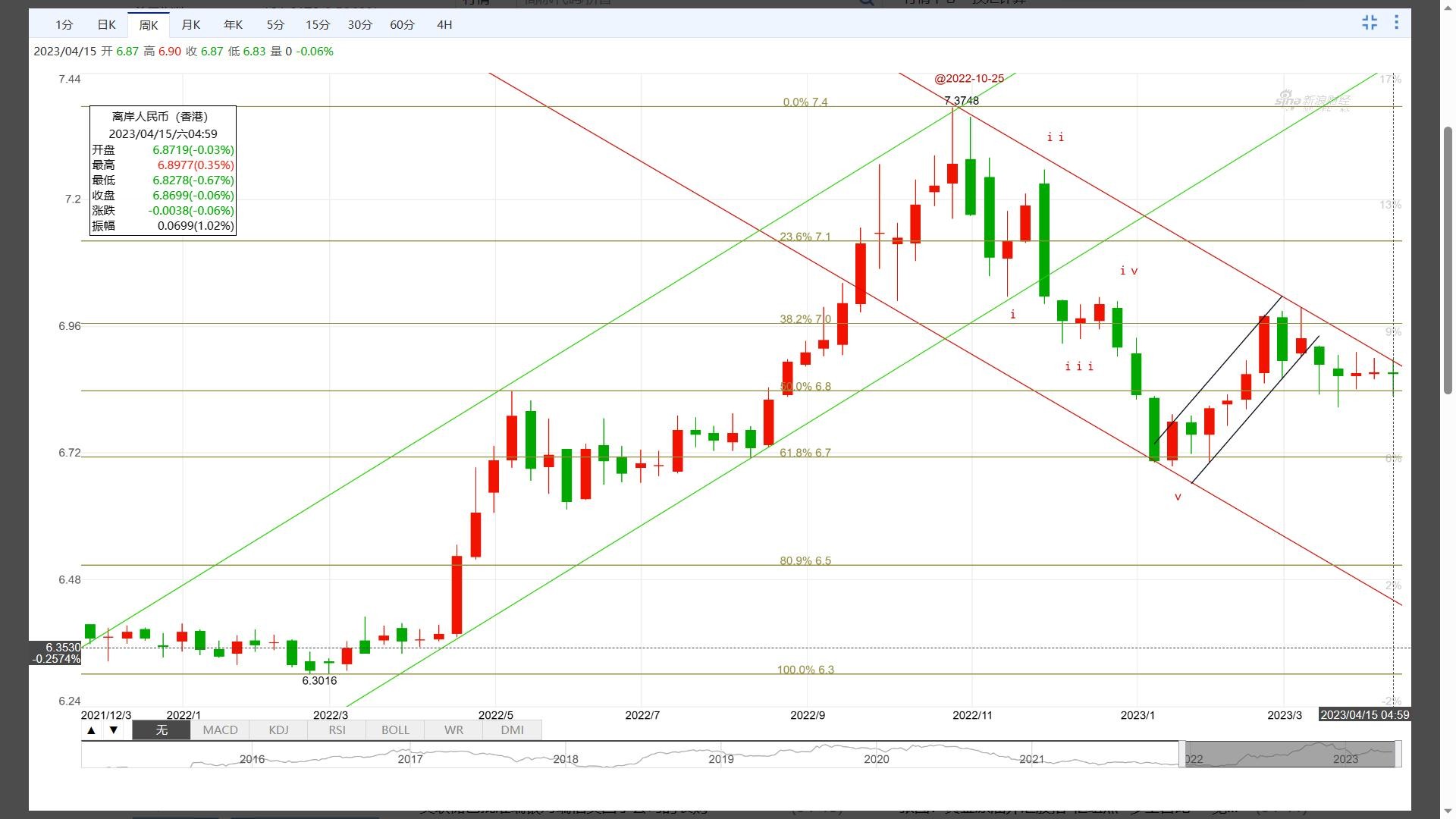 离岸人民币的中期趋势:是周线图上的红色升值通道,始自7.3748@2022-10-25。