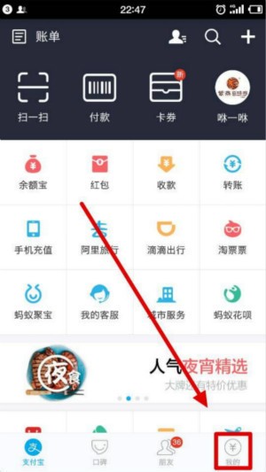 1、打开手机支付宝账户,出现以下页面。点击该页面中红色小圈表明的位置“我的”。