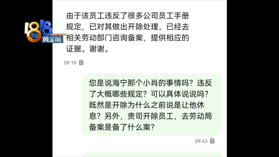 记者给晏督导留了电话,第二天一早,记者收到了一条短信,内容是:由于该员工违反很多公司员工手册规定,已对其做出开除处理,已经去相关劳动部门咨询备案,提供相应证据。记者打电话过去,对方没有接听,记者短信回复,是不是说的小肖那件事?违反了大概哪些规定?为什么之前又说是休息?记者还希望能确认对方的身份,但对方都没有回复。