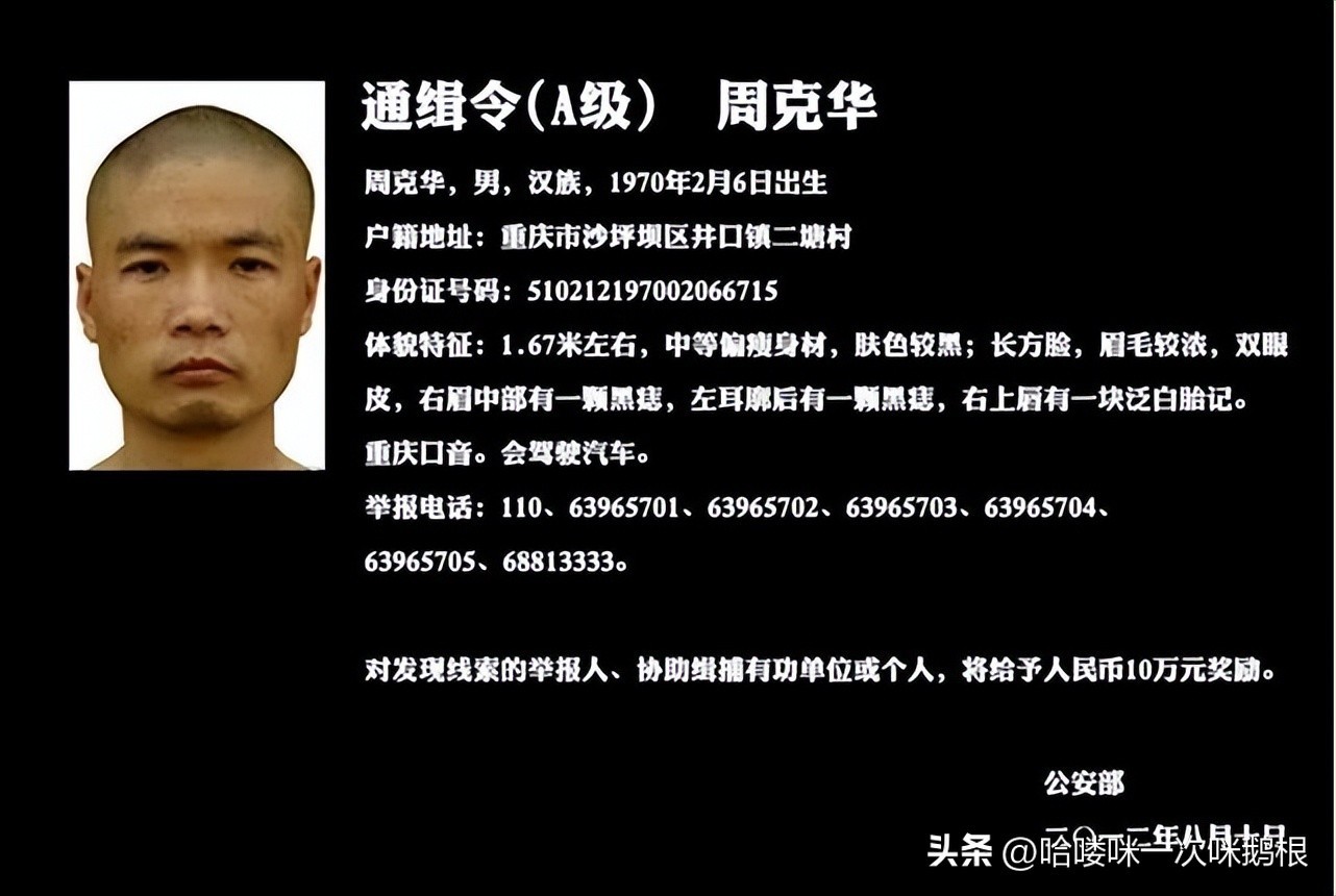 8·10案发后,重庆警方迅速印制了多达186万份的通缉令,发遍了重庆的大街小巷。加上媒体对该通缉令的滚动播出,周克华一时成为这座近3000万人口的城市中最焦点的人物。