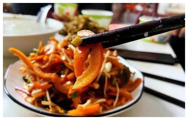 还有酸笋炒牛肉。这道菜的怪,在于它的酸。选用新鲜的酸笋和牛肉一起炒,酸笋的酸味和牛肉的鲜嫩,形成了一种独特的口感。