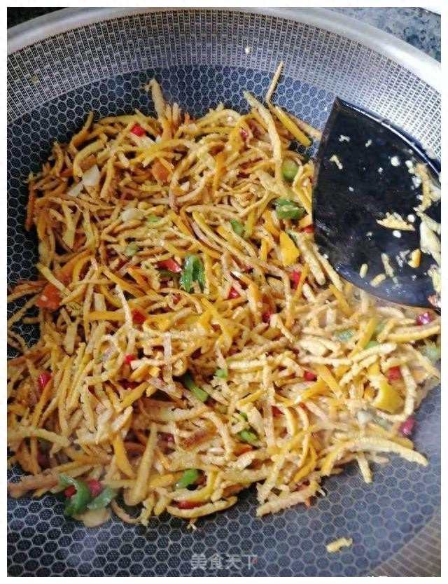 最后是茄子干炒肉。这道菜的怪,在于它的干。选用晒干的茄子和肉一起炒,茄子干吸收了肉的油脂,吃起来既有肉的鲜美,又有茄子干的香脆。