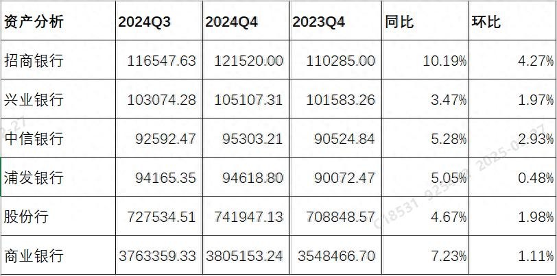 之前招商银行、中信银行、浦发银行和兴业银行披露了2024年业绩快报,接下来以业绩快报数据为基准,分别从资产、负债、净利润、不良率和拨备覆盖率等指标,与商业银行和股份行进行对比分析,看看四家银行经营表现如何?
