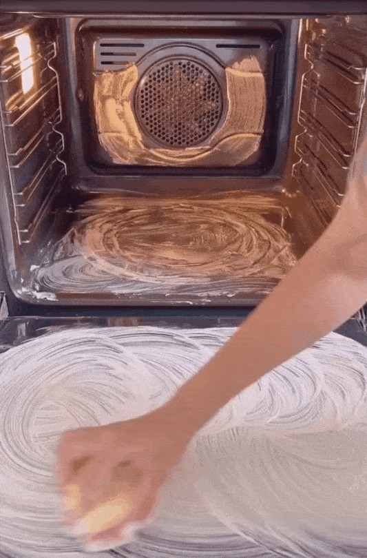 小苏打和洗洁精本身就有去污的能力,混合之后会形成膏状,方便沾附在烤箱内侧或门板上。