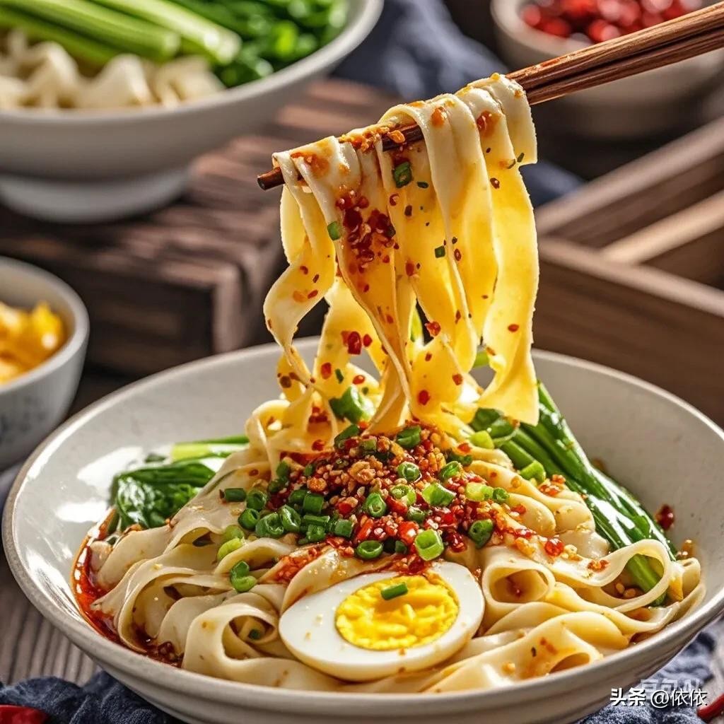• 油泼扯面:面条宽而有嚼劲,撒上葱花、蒜末、辣椒粉等,用热油浇淋,香气扑鼻。