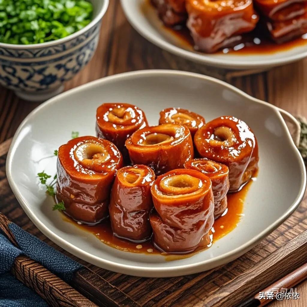 • 九转大肠:酸甜苦辣咸五味俱全,色泽红润,质地软嫩。