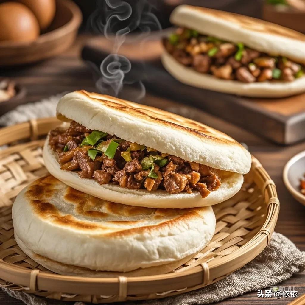• 肉夹馍:外酥里嫩的白吉馍夹着剁碎的卤肉,香气四溢,有腊汁肉夹馍、潼关肉夹馍等不同的做法。