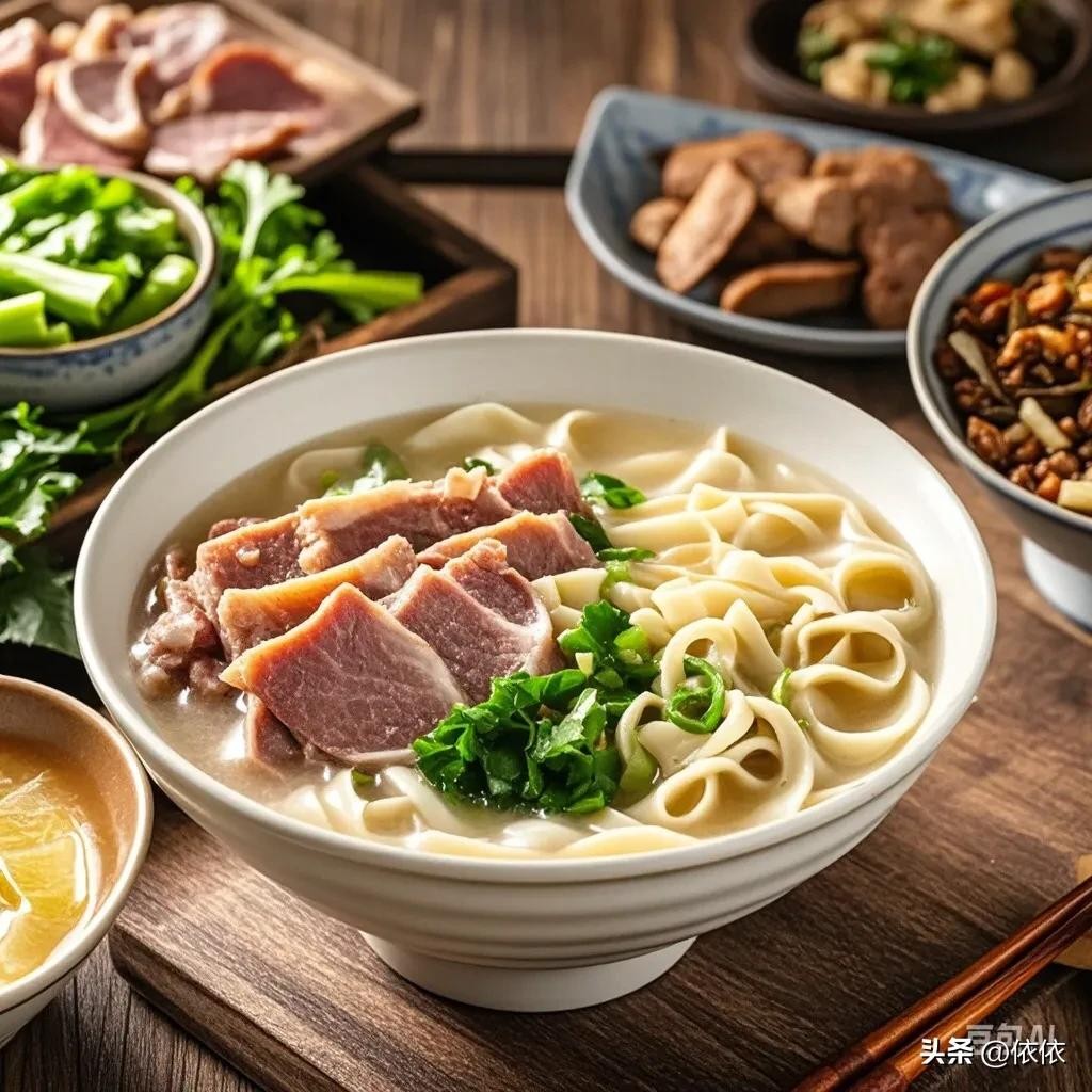 • 羊肉烩面:羊汤鲜美,面条筋道,配上千张丝、海带丝、鹌鹑蛋、羊肉块等,营养丰富。