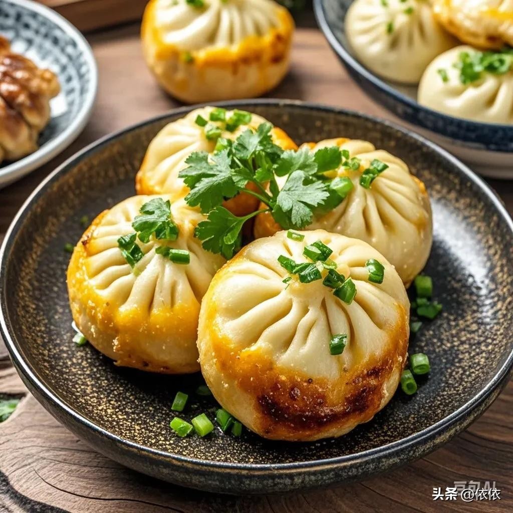 • 生煎包:底部煎得金黄酥脆,上面的皮柔软,肉馅鲜嫩多汁,咬一口满是香味。