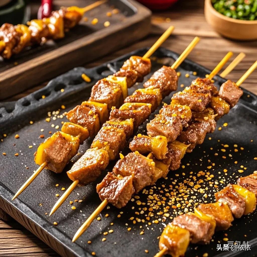 • 烤羊肉串:羊肉烤得滋滋冒油,撒上孜然、辣椒等调料,香气四溢。