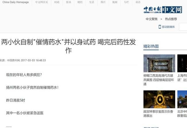一位扬州的医生,曾治疗过两位食用春药的年轻人,这次接诊也让他真正了解到春药对人体造成的伤害,这次事件曾刊登于《中国青年报》。