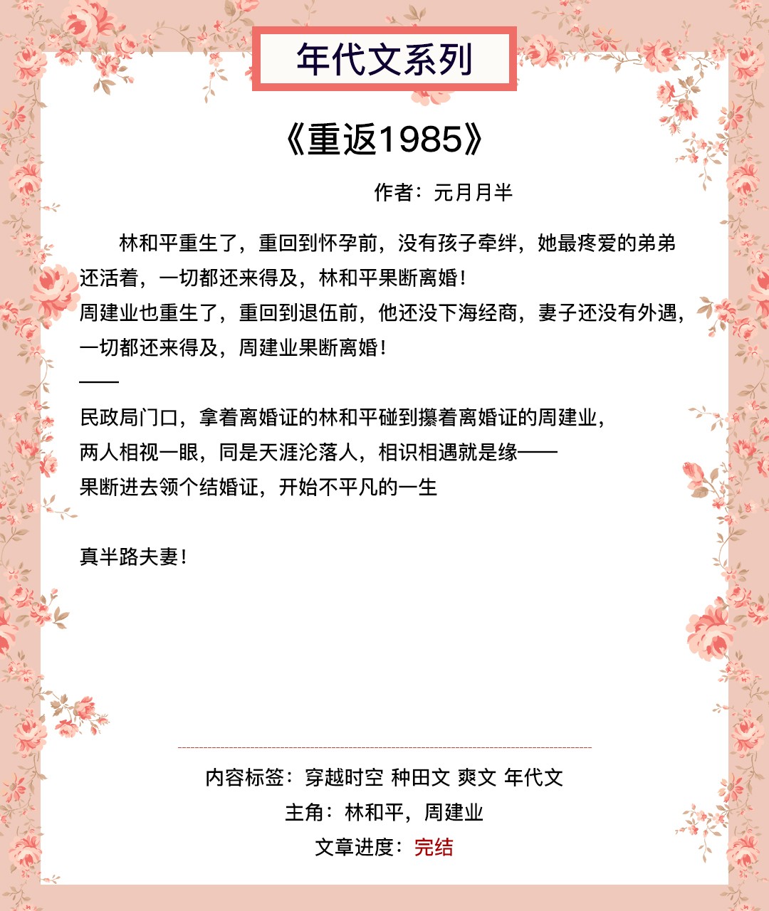 【短评】:双重生!女主前夫是个男同,上辈子女主悲惨结局,男主上辈子因为妻子带绿各种纠缠还入狱,两人重生后果断离婚,但是因为时代原因,离婚之后有很多不好解释的麻烦,既然彼此都知道对方是重生的,两人协议结婚。两人从合作伙伴到终身伴侣。