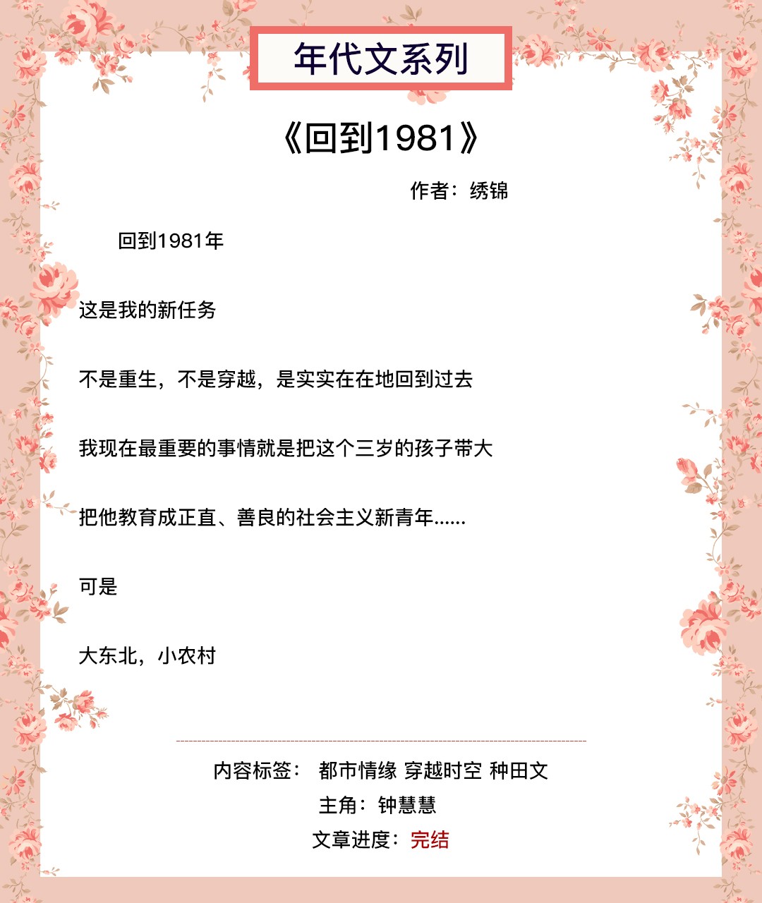 【短评】:纯纯的养成文,把自己的老公从小不点养大了,全文其实也挺励志的,女主回到80年代一直在创业,没有一成不变,男主也很聪明,要不也不会称为大老板是吧,很经典的文。