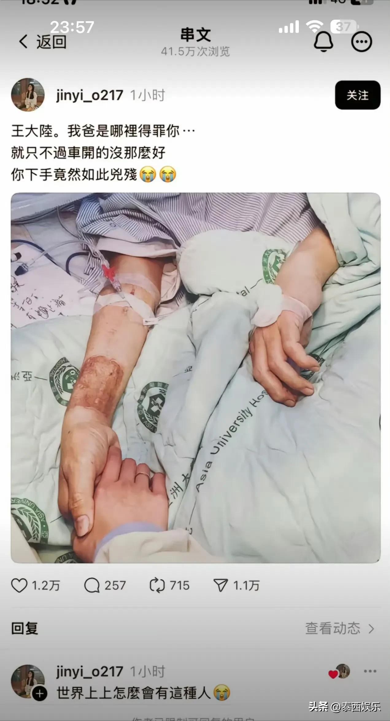 王大陆打人后续,女儿晒司机病床输液惨状,怒斥王大陆手段残忍