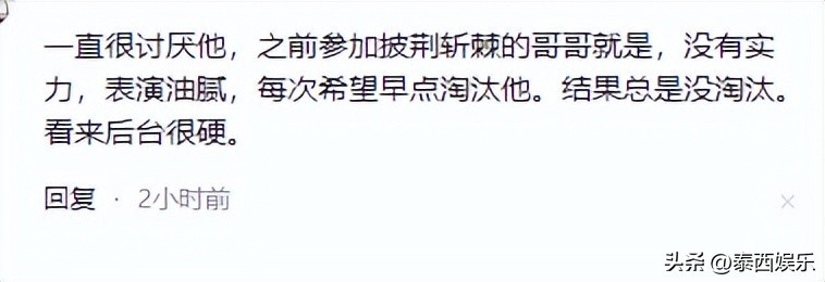 有网友表示她在很早之前就已经开始讨厌他了,之前王大陆参加披荆斩棘的哥哥这档综艺时,就表现的十分油腻,表演呢也很没有天赋,但意外的总是不会被淘汰,看来后台很硬。