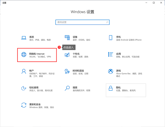 首先使用快捷键【win+i】打开“Windows设置”界面,接着找到“网络和Internet”的选项,点击进入。