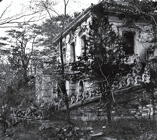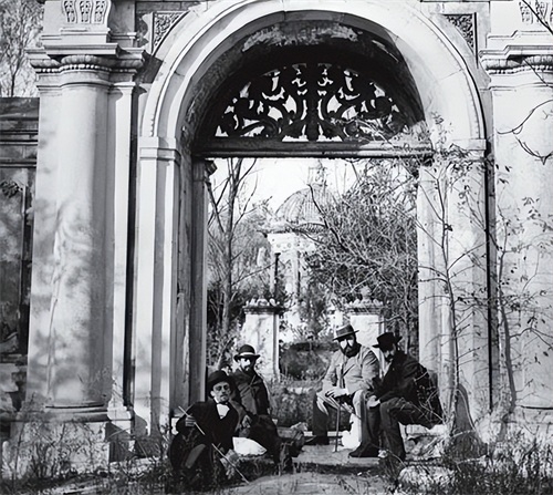 晚清1873年时期,恩斯特等一行人进入圆明园拍照,身旁还有几个外国人耀武扬威地留影。此地乃是圆明园内的西洋楼花园门前,亦是慈禧太后曾经最为喜爱的盛夏纳凉之地。其实当年圆明园在经历两场浩劫后,大体的建筑结构还算得以保存,不过一些精美 所有木质房顶皆被烧毁一空。